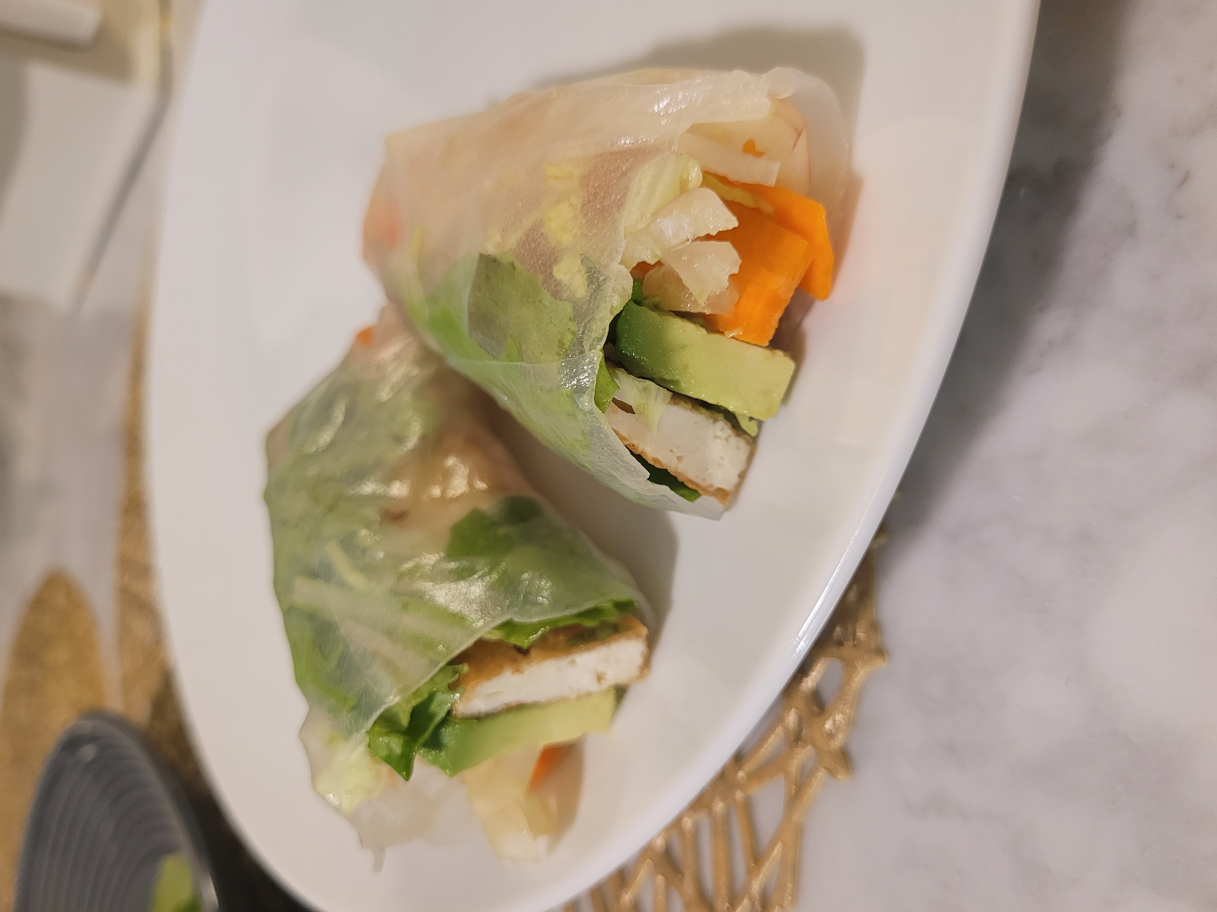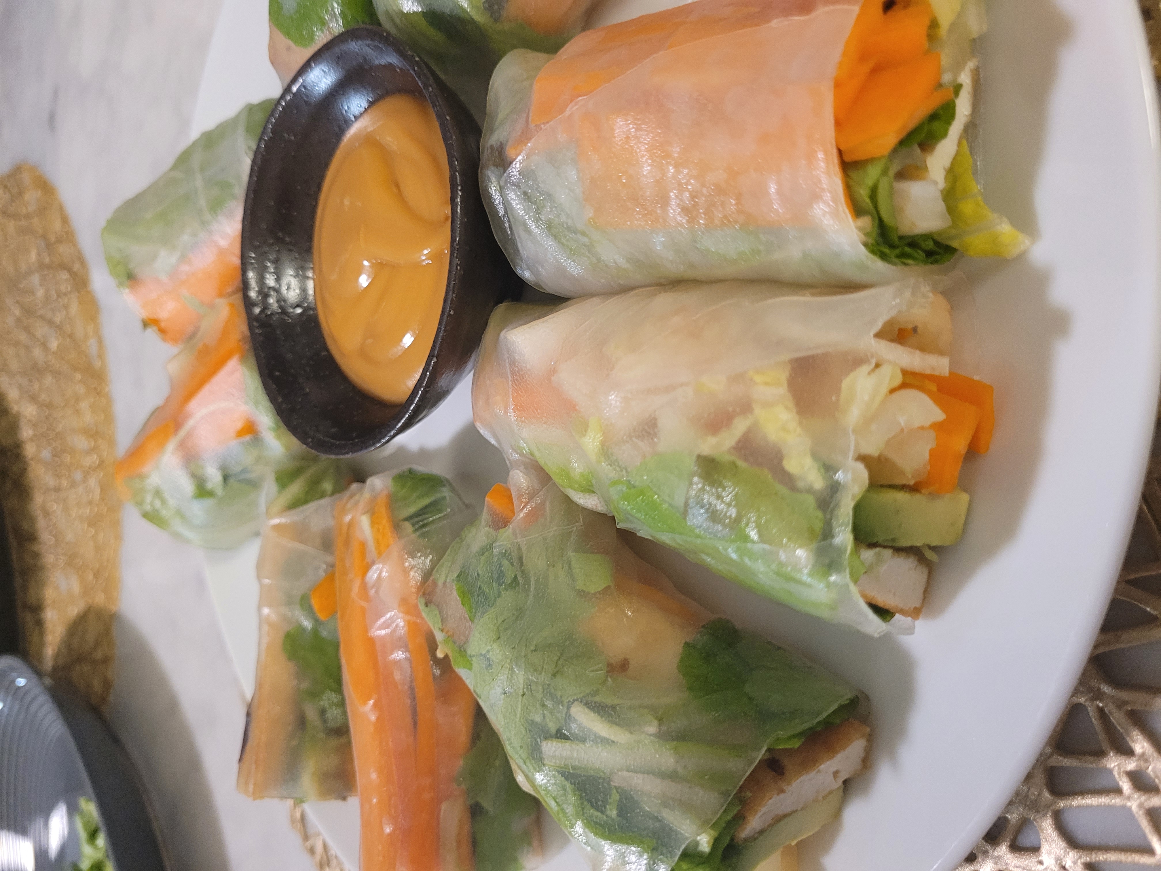 The next hard part was wrapping. To get that perfectly taut, tightly wrapped spring roll was surprisingly difficult. The rice paper is sticky and sticks to your hands, the surface you're working on, and to itself. That meant trying to apply enough pressure so that you don't rip the rice paper but still compact the veggies down while also trying not to let the rice paper touch any surfaces you didn't want was a challenge, but after about 10-15 rolls, I started to get it down. They never got as pretty as the ones at a restaurant, but they were edible.