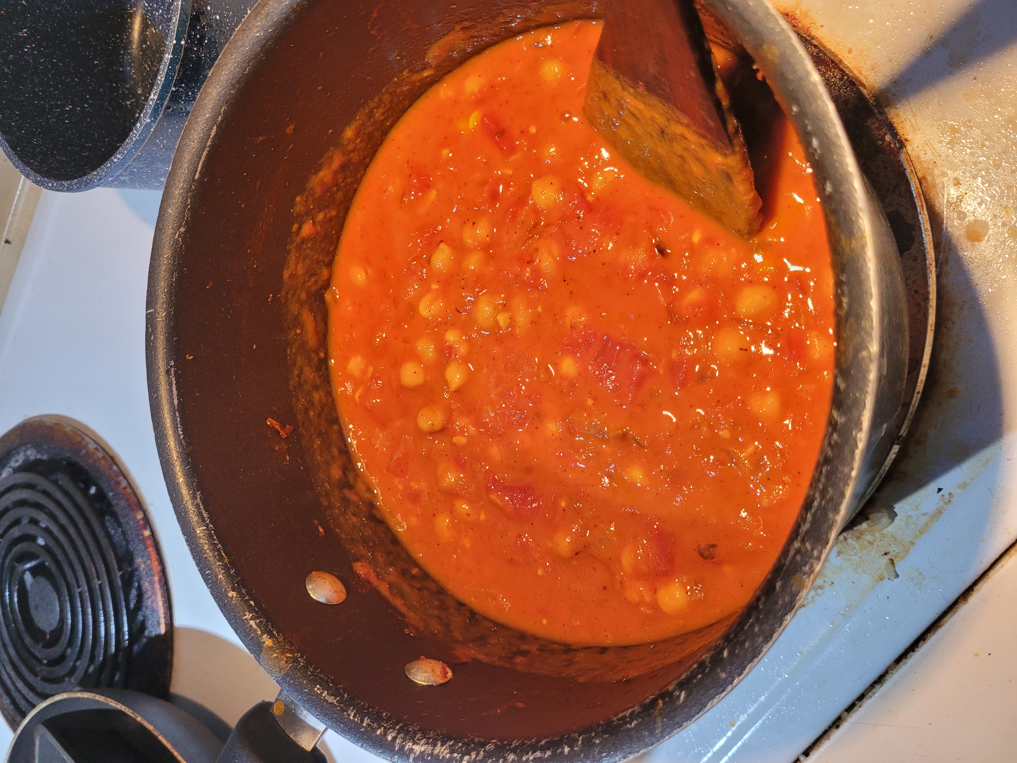 There were also some refinements I want to make, which I'll explain below: another onion, blend the onion and spices before adding tomatoes/tomato paste/chickpeas/milk, drain some of the tomato water, and add some honey or sugar.