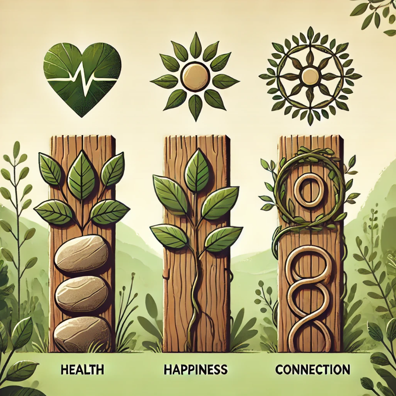 Health is the foundation that supports everything else in life. Remember that you're not just taking care of your mind, body, and spirit for health's sake, either! Health has direct connections to happiness and connection too! Regular exercise can boost mood (happiness) and provide social opportunities (connection), just to give a couple examples. When you feel strong, energized, and mentally clear, you can pursue your passions, cultivate deep relationships, and fully embrace the world around you. And don't forget that most of the actions you do to be healthy are also better for the planet!