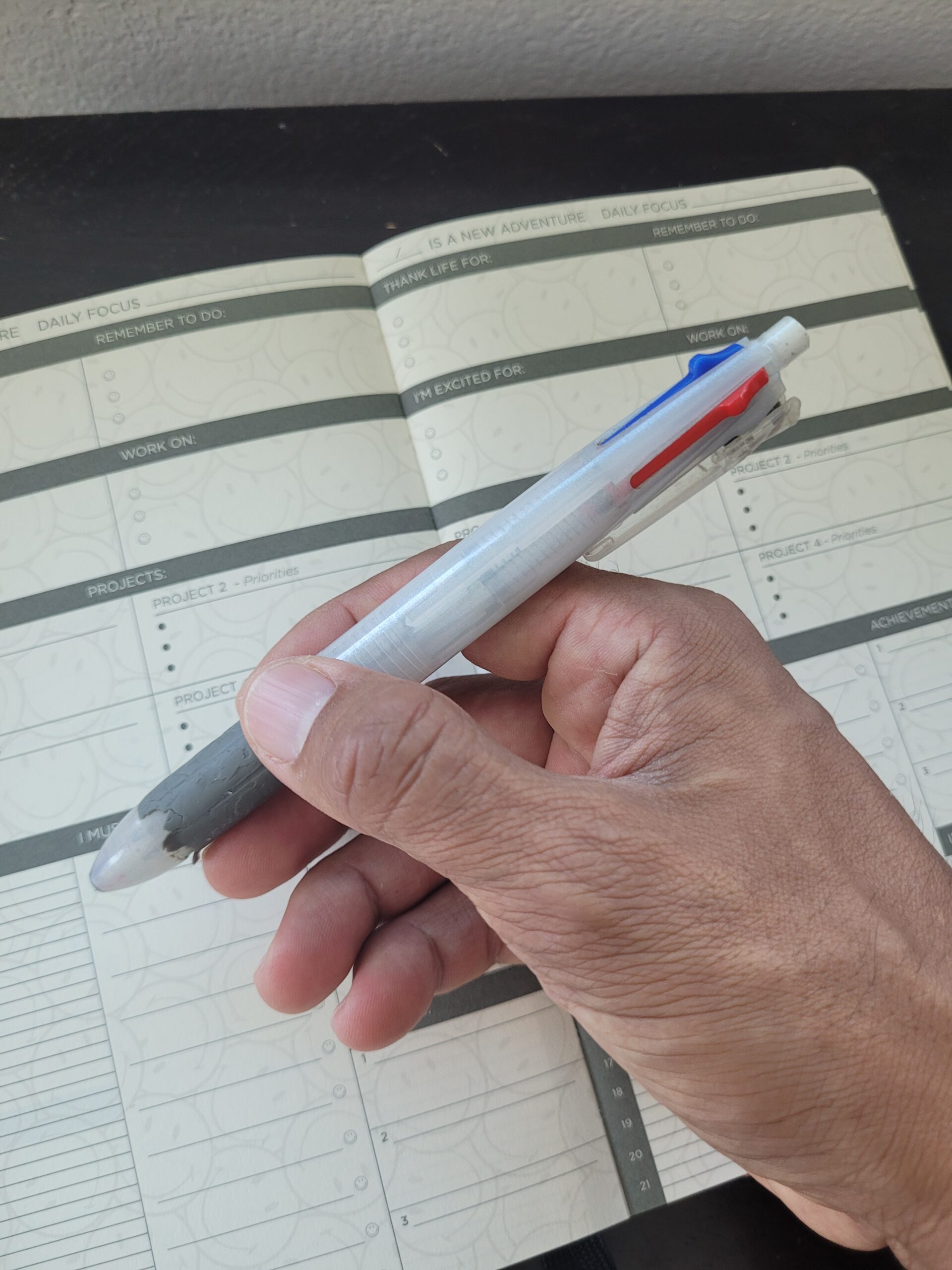 Recently, the pen has started to wear out. The ink selector sliders are starting to stick and the rubber grip is falling apart, so I’ve been considering replacing the pen, but I haven’t decided on the proper way to keep it memorialized somewhere. 12 years is a long time to use one pen!